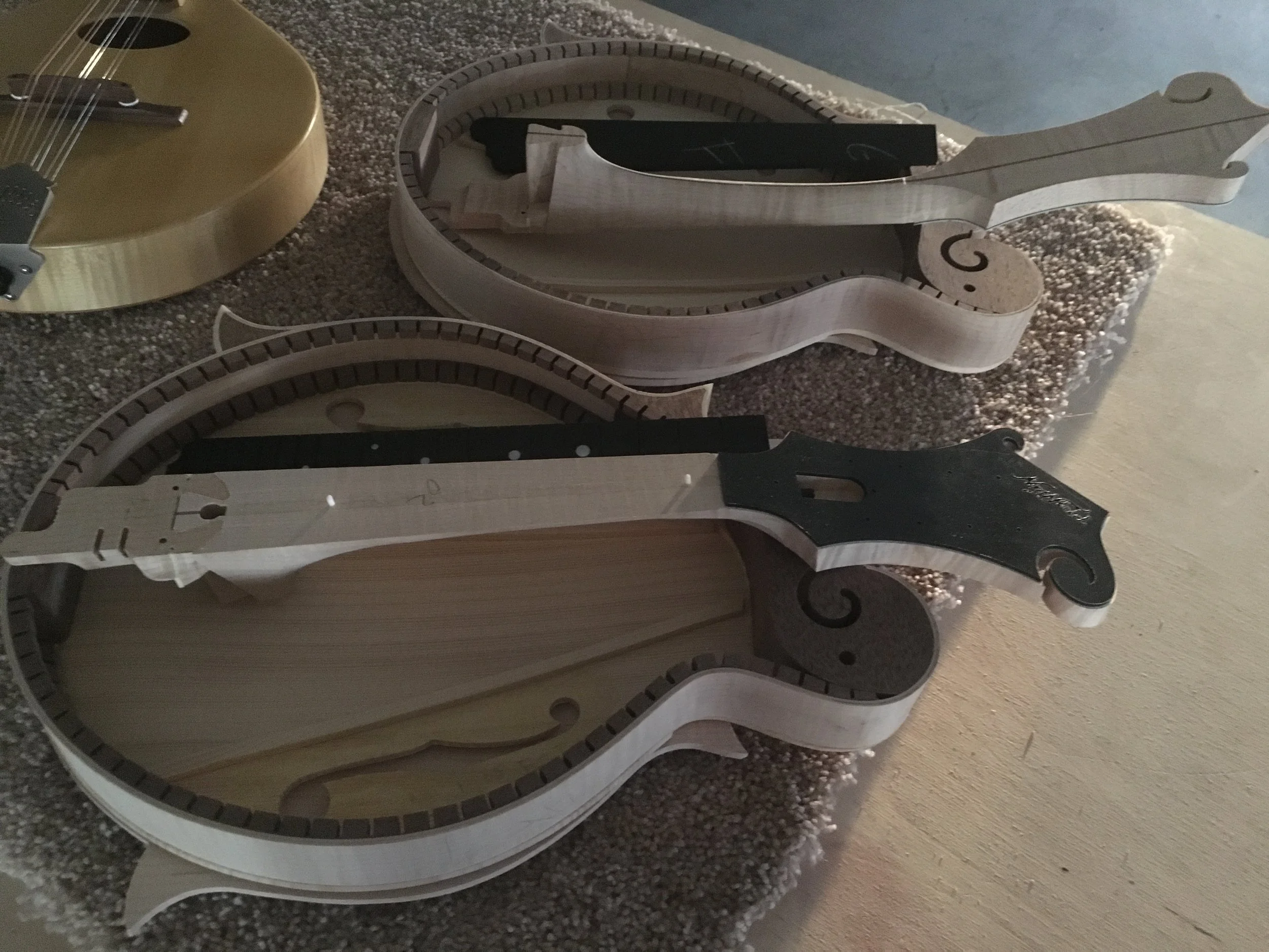 Origin: After a lot of experimentation we have decided to make this instrument collaboratively between our two workshops. It's one part practicality and one part continuity. In our efforts to build the amount of instruments we feel there is demand for we need to enlist all of our experienced staff to share the extensive load of work involved in F5 production. There is CNC operation, assembly, binding, long hours of sanding, etc. Like a great musical band we have a sense of place, cooperation, and overlap between many tasks. The delicate art of shading and finishing is an enormous consideration. Our long-time team member Lao Yin is a master of the coloring and finishing of musical instruments. It would be folly for us not to entrust him with the task of shading and bursting our premier mandolins. We believe it’s the hands, eyes, and experience that make the mandolin. Here's our process: All wood selection is done from our Michigan shop’s premium stash. We make all of the mandolin parts in Michigan, utilizing machines, fixtures, and handwork. With the top and back carved, ribs formed, blocks set, and neck completed with truss rod, overlays, and fretboard we partially assemble the instrument. The top and rib assembly are glued up, the dovetail neck joint is fine-tuned and fit to the body. The neck is then removed so we can pack the instrument "kit" in a box along with other supplies we're sending to the gang in Qingdao. The assembly is completed and then sanding and coloring steps are performed by Lao Yin. After a couple weeks of curing the mandolin is sent back to us in Michigan where we then perform final finish steps, wet sanding, french polishing, hardware installation, and setup. Sound difficult? It is - but that's how we'll do it. Together. That's how we've done everything and that's why we're confident we're making better instruments than we ever have.